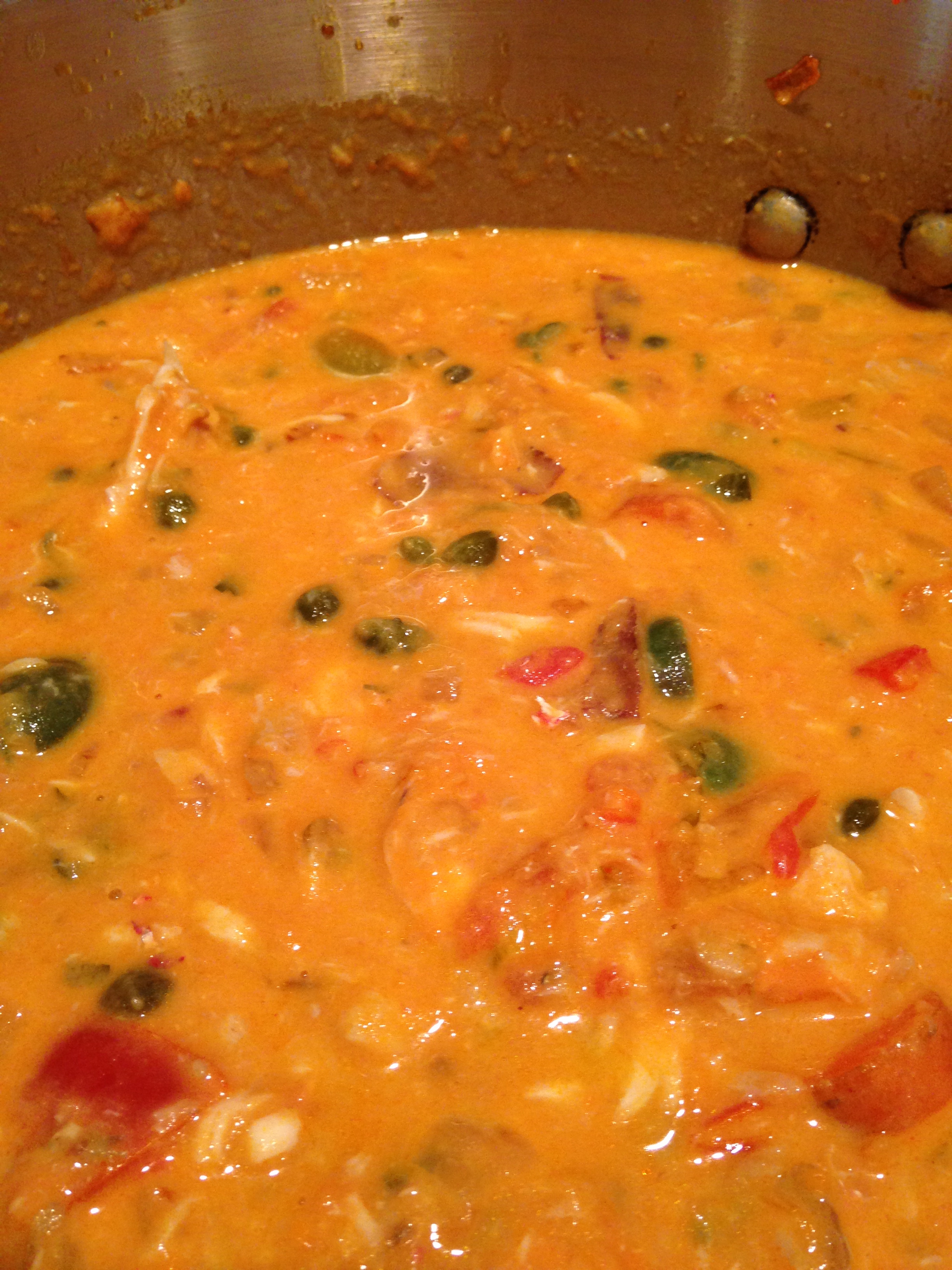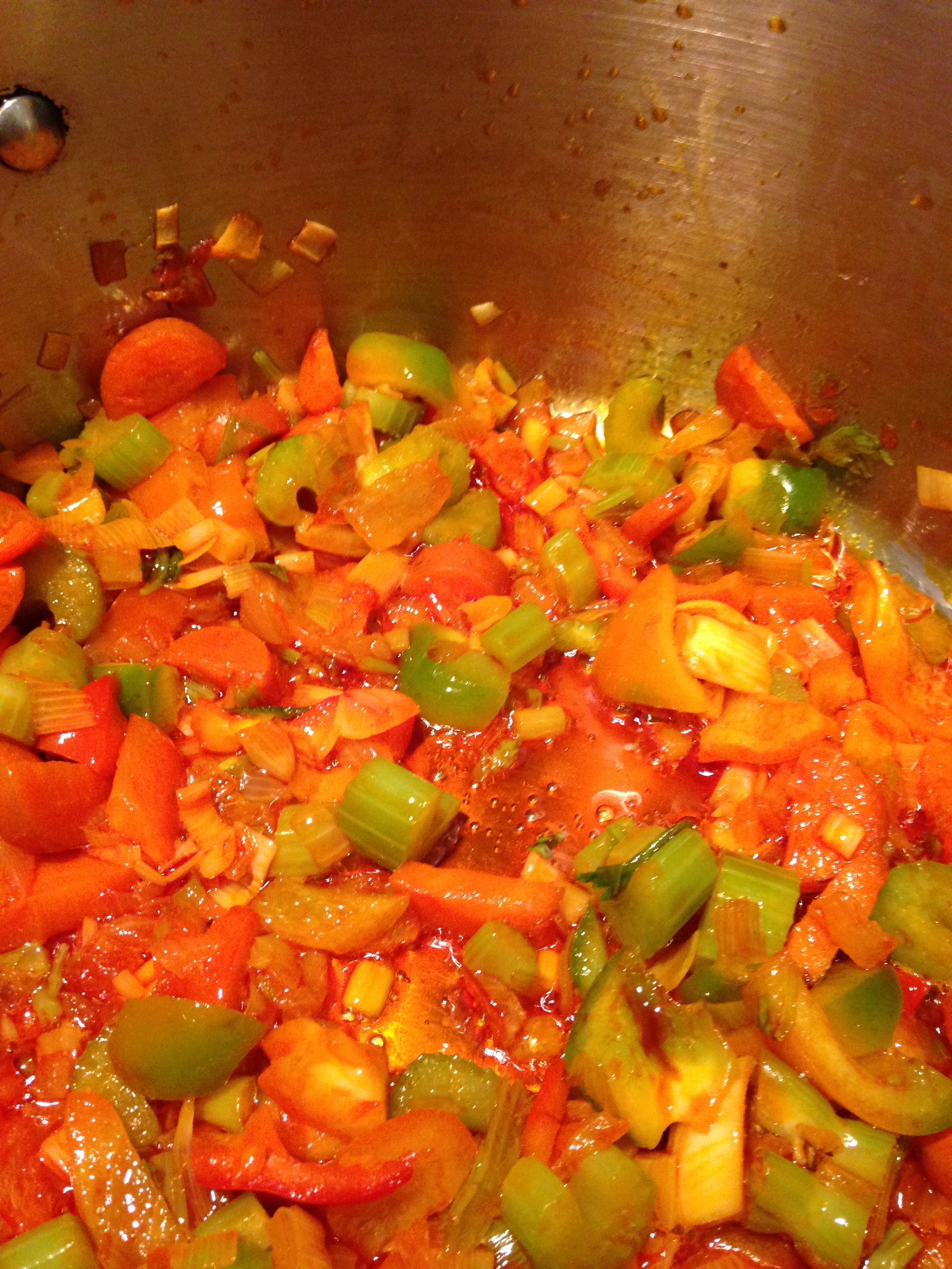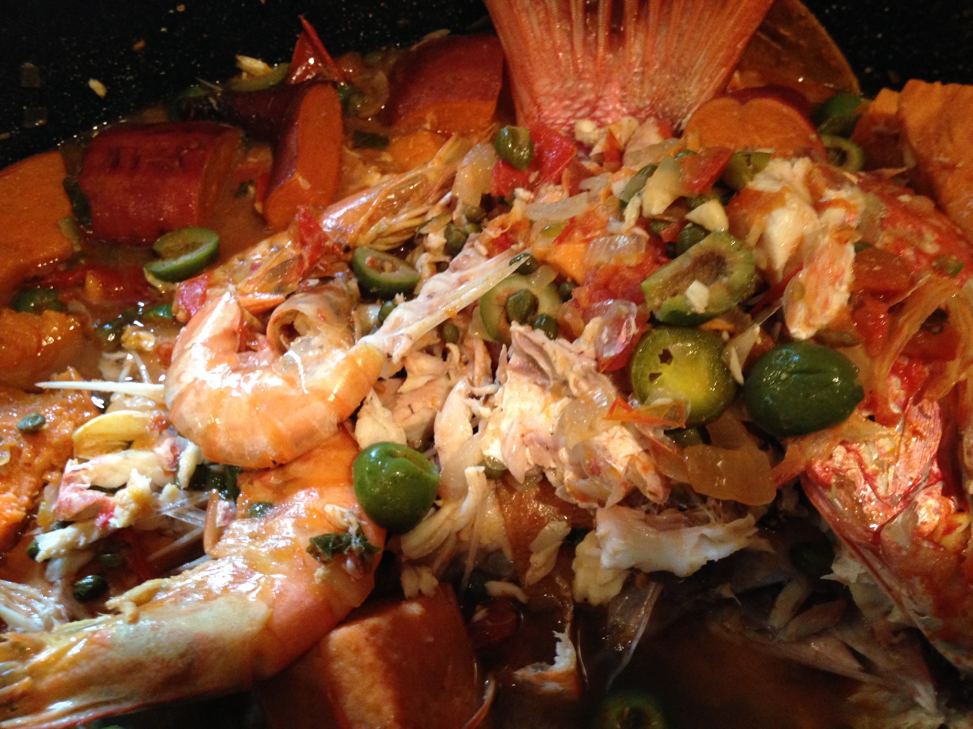 I’m sold on the flavor in the early stages of cooking. I pour a generous amount into the pan, add onions, carrots, celery, leeks, garlic and tomatoes. Then when its all worked itself down, I add the tomato, olives, and caper mixture from last night. Mix in the mashed sweet potatoes, then a can of coconut milk and I am cooking Bahian.